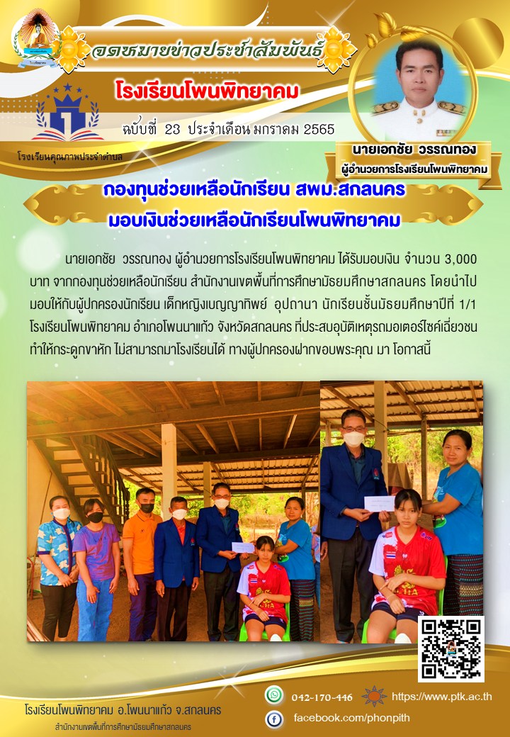 ท่านผู้อำนวยการเอกชัย วรรณทอง ผู้อำนวยการโรงเรียนโพนพิทยาคม พร้อมคณะครู มอบเงินกองทุนช่วยเหลือนักเรียน จากสำนักงานเขตพื้นที่การศึกษามัธยมศึกษาสกลนคร จำนวนเงิน 3,000 บาท มอบให้กับครอบครับ เด็กหญิงเบญญาทิพย์ อุปถานา (บ้านวังปลาเซือม ) นักเรียนชั้น ม.1 ที่ประสบอุบัติเหตุ รถมอเตอร์ไซค์เฉี่ยวชน บริเวณถนนหน้าโรงเรียนโพนพิทยาคม เมื่อเดือนธันวาคม 2564 ที่ผ่านมา