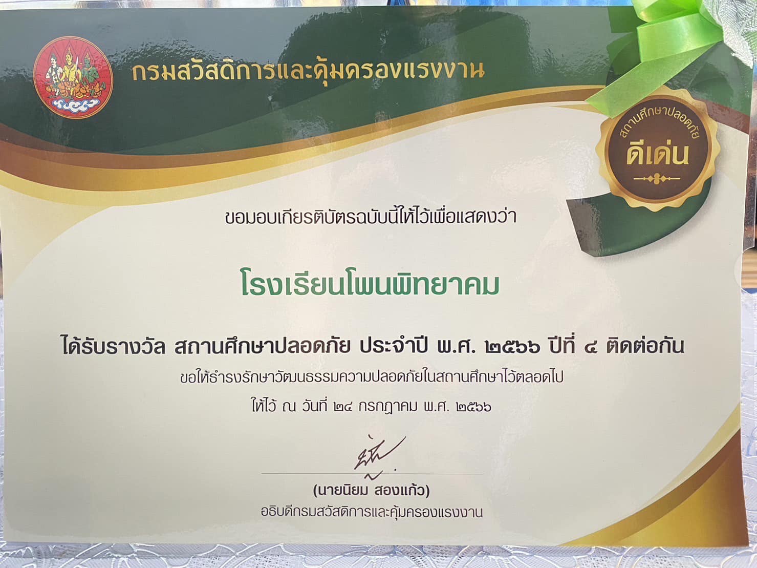 เมื่อวันที่ 14 ธันวาคม 2566 ที่ผ่านมา นายโสภณ อุดรสรรพ์ ผู้อำนวยการโรงเรียนโพนพิทยาคม เป็นตัวแทนรับมอบรางวัลเชิดชูเกียรติ รางวัลสถานศึกษาปลอดภัย เป็นปีที่ 4 จากสำนักงานสวัสดิการและคุ้มครองแรงงาน จังหวัดสกลนคร โดยมีนางรณิดา เหลืองฐิติกุล รองผู้ว่าราชการจังหวัดสกลนคร เป็นประธาน ณ ห้องอิรวดี โรงแรมพีซี แกรนด์ พาเลช จังหวัดสกลนคร