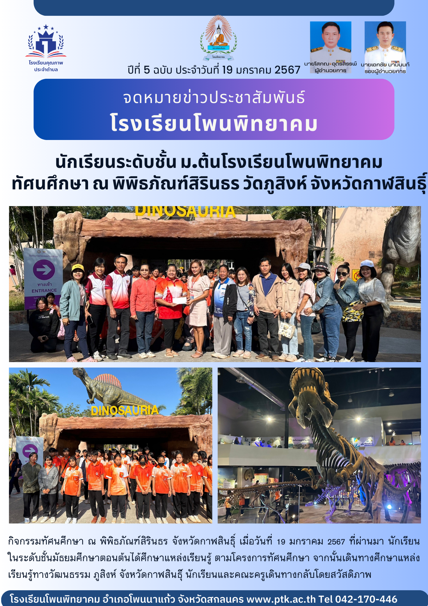 กิจกรรมทัศนศึกษา ณ พิพิธภัณฑ์สิรินธร จังหวัดกาฬสินธุิ์ เมื่อวันที่ 19 มกราคม 2567 ที่ผ่านมา นักเรียนในระดับชั้นมัธยมศึกษาตอนต้นได้ศึกษาแหล่งเรียนรู้ ตามโครงการทัศนศึกษา จากนั้นเดินทางศึกษาแหล่งเรียนรู้ทางวัฒนธรรม ภูสิงห์ จังหวัดกาฬสินธิุ์ นักเรียนและคณะครูเดินทางกลับโดยสวัสดิภาพ