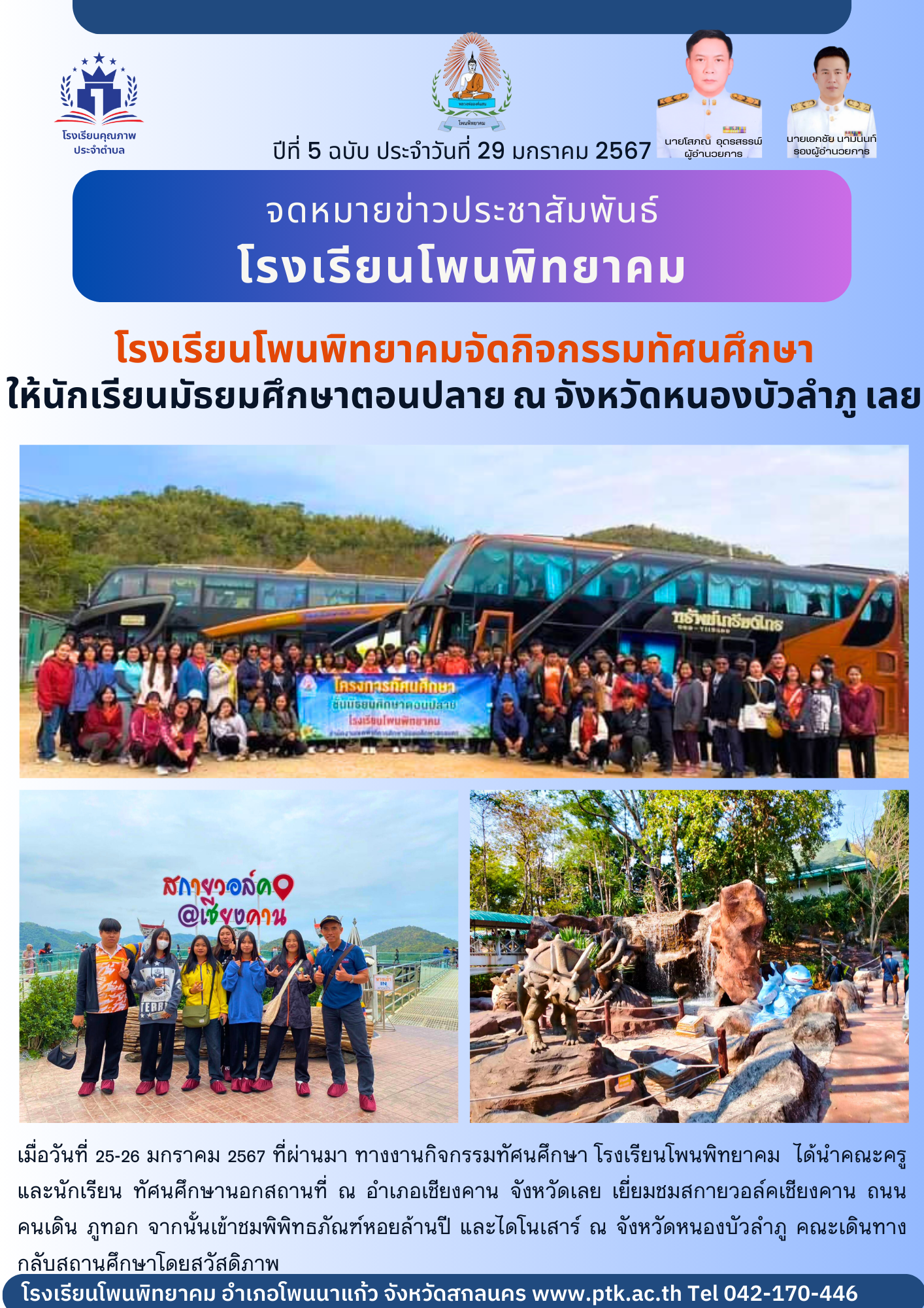 เมื่อวันที่ 25-26 มกราคม 2567 ที่ผ่านมา นักเรียนโรงเรียนโพนพิทยาคม ระดับชั้นมัธยมศึกษาตอนปลาย ทัศนศึกษาแหล่งเรียนรู้ ณ จังหวัดเลย หนองบัวลำภู ศึกษาแหล่งเรียนรู้ทางธรรมชาติ วิถีชีวิต ความเป็นอยู่ เพื่อนำมาประยุกต์ใช้ในชีวิตประจำวัน