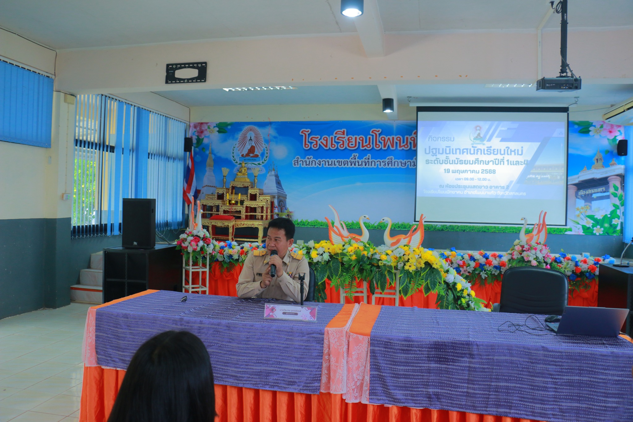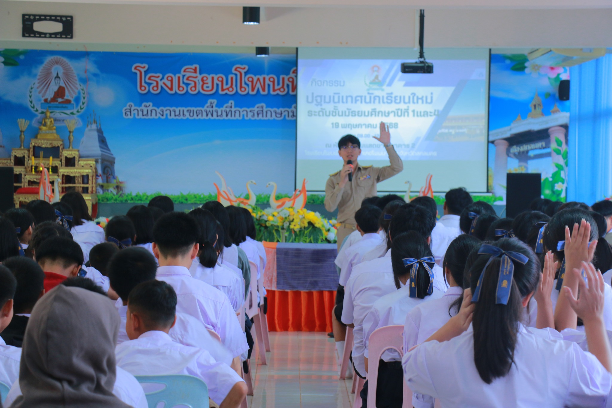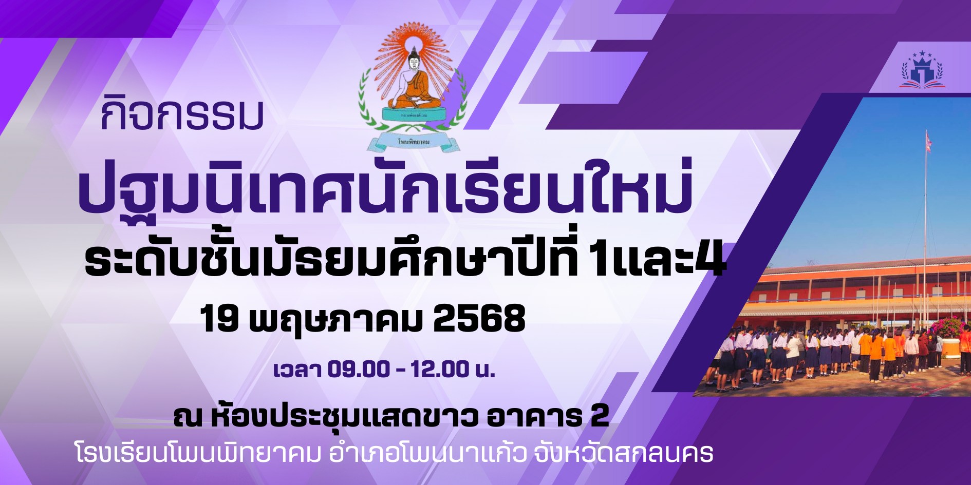 19 พฤษภาคม 2568 เวลา 09.00 -12.00 กลุ่มบริหารงานวิชาการ ได้จัดกิจกรรมปฐมนิเทศ นักเรียนใหม่ ระดับชั้นมัธยมศึกษาปีที่ 1 และ 4 ประจำปีการศึกษา 2568 โดยมี ผอ.โสภณ อุดรสรรพ์ เป็นประธานในพิธี ในกิจกรรม มีรองผอ.เอกชัย นามนนท์ หัวหน้ากลุ่มบริหาร ครู หัวหน้างาน มาให้ความรู้นักเรียน แนวทางการการเรียน การร่วมกิจกรรมต่าง ๆ ในสถานศึกษา ของเรา ณ โอกาสนี้ ทางโรงเรียนได้เชิญศิษย์เก่า นักศึกษาพยาบาลศาสตร์ วิทยาลัยพยาบาลบรมราชชนนี จ.อุดรธานี นางสาวณัฐธิดา วรราช และนางสาวขนิษฐา มอมุงคุณ มาให้ความรู้แนวทางการศึกษาต่อสาขาพยาบาล รวมถึงนักศึกษาฝึกประสบการณ์วิชาชีพครู มาให้ความรู้การศึกษาต่อในสาขาครุศาสตร์ จากมหาวิทยาลัยราชภัฎสกลนคร นางสาวหงษ์ลัดดา อำภาวงศ์ และนางสาวพลอยมณี สุคำภา มาให้ความรู้ เพื่อสร้างแรงบันดาลใจให้นักเรียน ณ โอกาสนี้