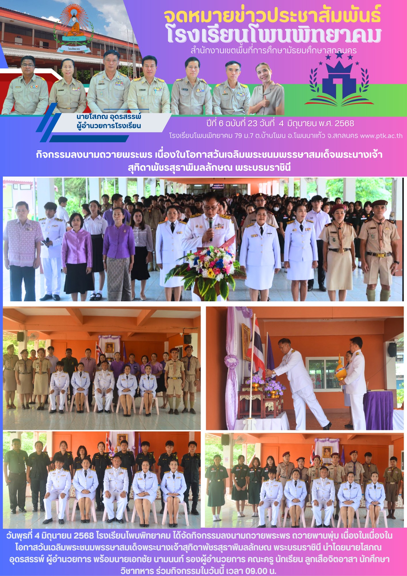 วันพุธที่ 4 มิถุนายน 2568 โรงเรียนโพนพิทยาคม ได้จัดกิจกรรมลงนามถวายพระพร ถวายพานพุ่ม เนื่องในเนื่องในโอกาสวันเฉลิมพระชนมพรรษาสมเด็จพระนางเจ้าสุทิดาพัชรสุธาพิมลลักษณ พระบรมราชินี นำโดยนายโสภณ