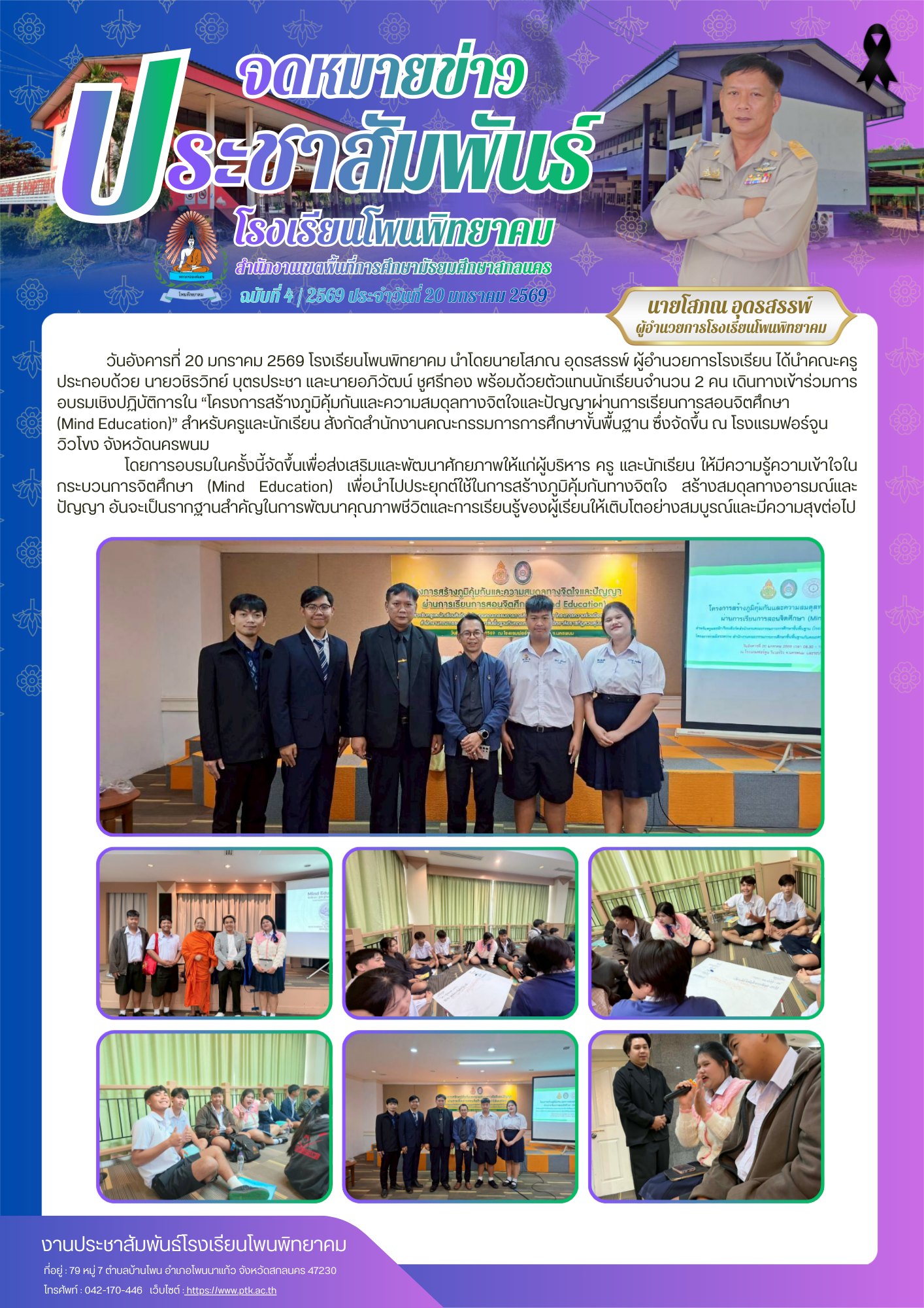 วันอังคาร ที่ 20 มกราคม 2569 โรงเรียนโพนพิทยาคม โดยนายโสภณ อุดรสรรพ์ ผู้อำนวยการโรงเรียน ได้นำคณะครูประกอบด้วย นายวชิรวิทย์ บุตรประชา และนายอภิวัฒน์ ชูศรีทอง พร้อมด้วยตัวแทนนักเรียนจำนวน 2 คน เดินทางเข้าร่วมการอบรมเชิงปฏิบัติการใน “โครงการสร้างภูมิคุ้มกันและความสมดุลทางจิตใจและปัญญาผ่านการเรียนการสอนจิตศึกษา (Mind Education)” สำหรับครูและนักเรียน สังกัดสำนักงานคณะกรรมการการศึกษาขั้นพื้นฐาน ซึ่งจัดขึ้น ณ โรงแรมฟอร์จูนวิวโขง จังหวัดนครพนม