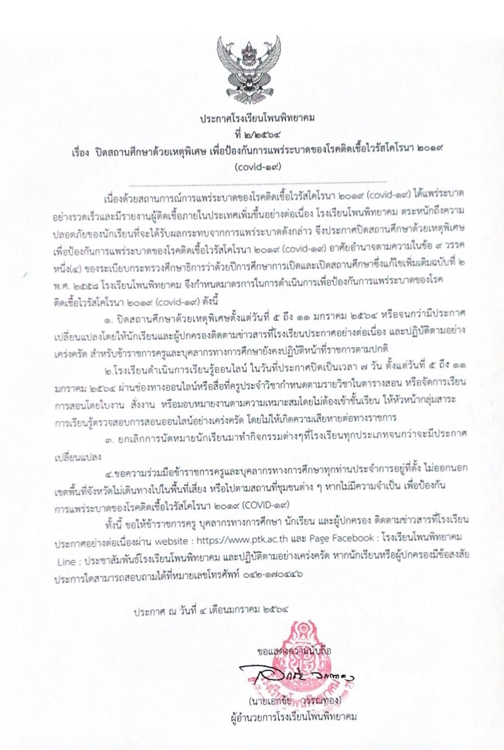 โรงเรียนโพนพิทยาคม ประกาศปิดสถานศึกษาด้วยเหตุพิเศษ ระหว่างวันที่ 5-11 มกราคม 2564 เพื่อป้องกันการแพร่ระบาดของโรคติดเชื้อไวรัสโคโรนา(COVID-19) ให้นักเรียนเรียนออนไลน์ตามช่องทางที่ครูผู้สอนกำหนดไว้