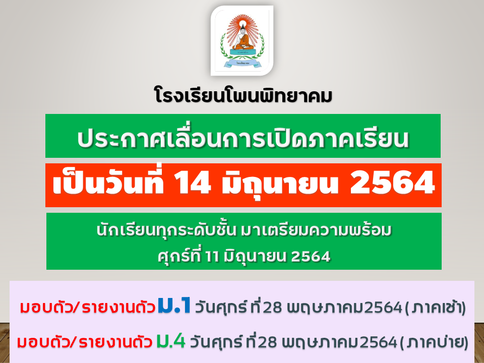 14 มิถุนายน 2564 เปิดภาคเรียนที่ 1 / 2564